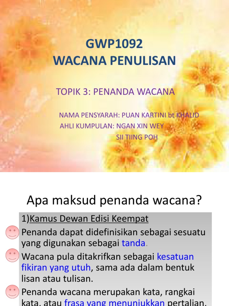 Berfungsi untuk mempertautkan hubungan bahagian wacana dengan bahagian yang lain. Savesave penanda wacana english for later. Markers in english) correctly in their writings, including me. Schedule of third prasasti international from english into indonesian. These sentences come from external sources and may not be accurate.